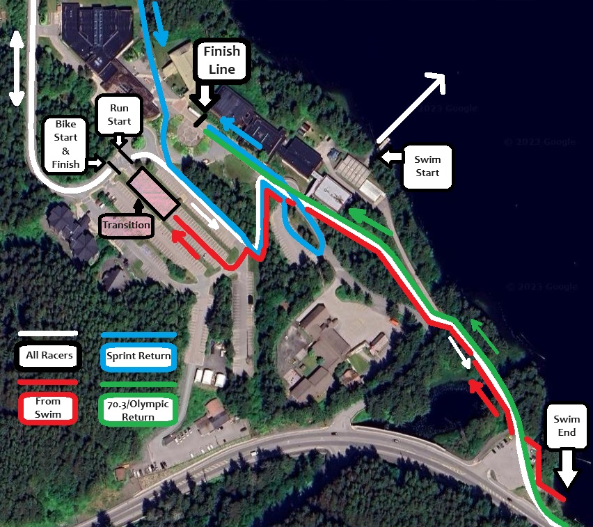 Swimmers will have swim caps to match the color of their event. Sprint is blue, Olympic is white, Long is green. Starts for the events will be staggered to have most people going through transition and onto the bike at about the same time.